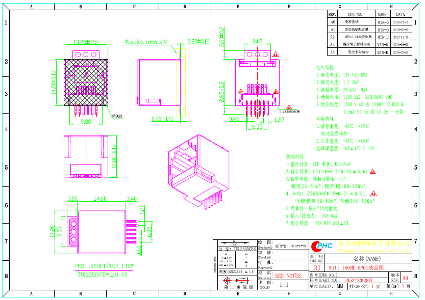RJ11 6P6C SMT电话母座(PH1052-206003)